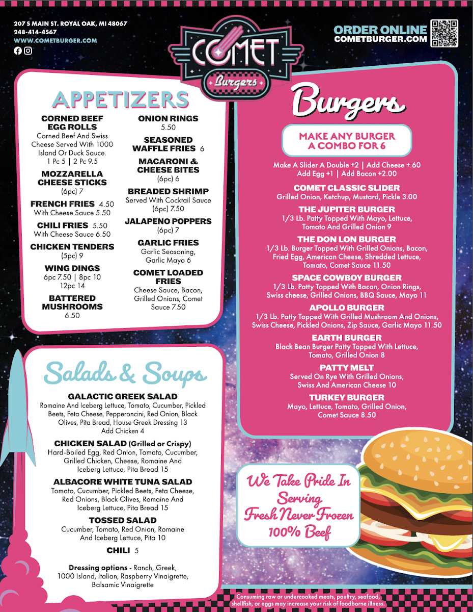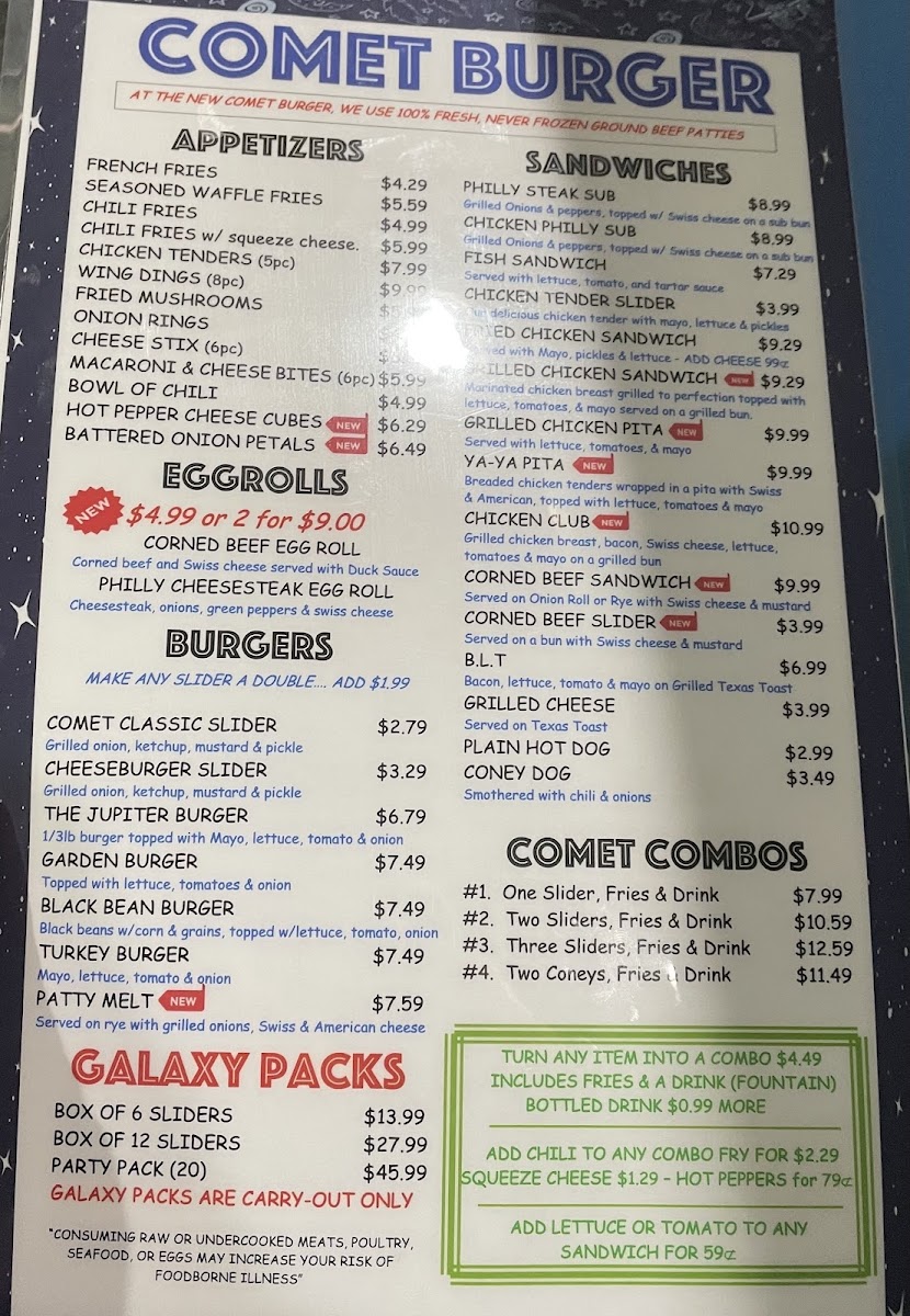 1/3 lb. burger topped with grilled onions, bacon, fried egg, american cheese, shredded lettuce, tomato, comet sauce, and pickles